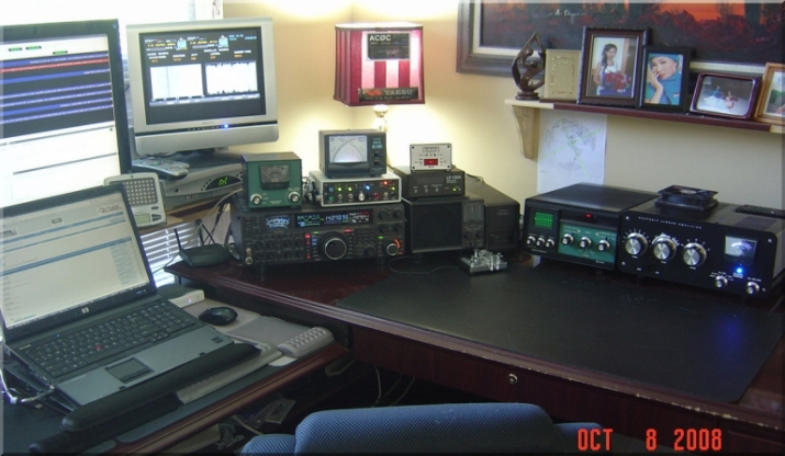 The photo (left) here shows operation on the Queen Mary. I had no idea there was a ham shack in operation but we saw it on the tour. The manager of that shack would not believe I had my license - but in those days I carried a copy in my wallet. Unfortunately, the wallet was in the car - and the Queen Mary parking lot is a huge space making it a long haul from the ship's radio room to the car. Upon return, they did let me have a turn at the mic. I thought it was ironic that there was no code key connected. This shot, from about 2010, shows me setting in front of what may well be the most impressive rack of boat- anchor gear in existence. I was a guest of Thomas NE7X and the Central Arizona DX Club at the time.