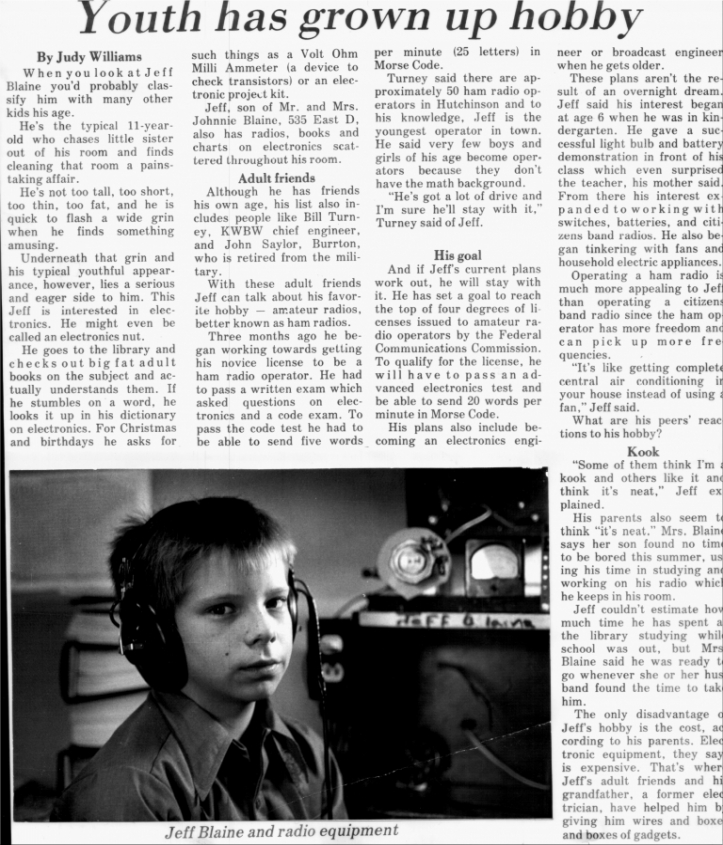 The interest in electronics continued to grow and at age 11, as part of a Boy Scouts merit badge project on electronics, I had attempted to build a small few-transistor shortwave radio sold by Radio Shack. For some reason, I could not make it work properly. My dad had a friend who lived next door to a ham radio operator and suggested he may be able to help figure out the problem. A few days later, I was in the basement located radio shack of Bill Turney, then WA0RFF. Bill ultimately helped track down a transistor which was incorrectly oriented bringing function to the Radio Shack kit. But that visit also introduced me to the world of ham radio...