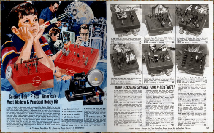 For Christmas one year, at age 10, I think, Santa brought me a Radio Shack 100-in-1 electronics project kit. A variety of parts were mounted on a cardboard backing and interconnections were made per a manual by connecting wires between the spring-like terminals adjacent to each part. That kit opened the door to all the "cool" things that electronics offered. I remember one night setting up a siren from the kit and hooking it to a photo-cell switch. When my door was opened, it broke the light beam and activated the siren bringing quite a surprise to my mom.