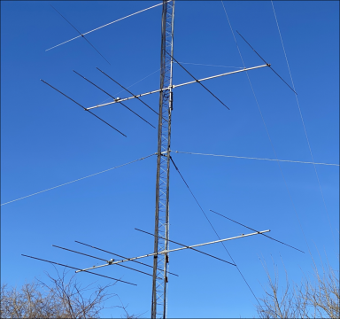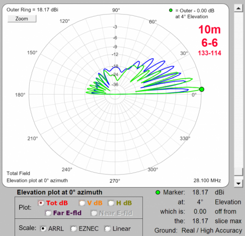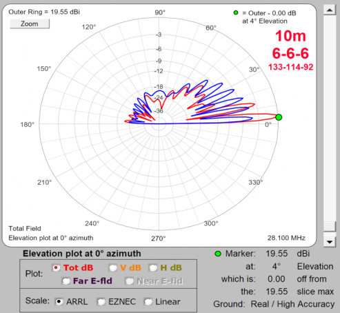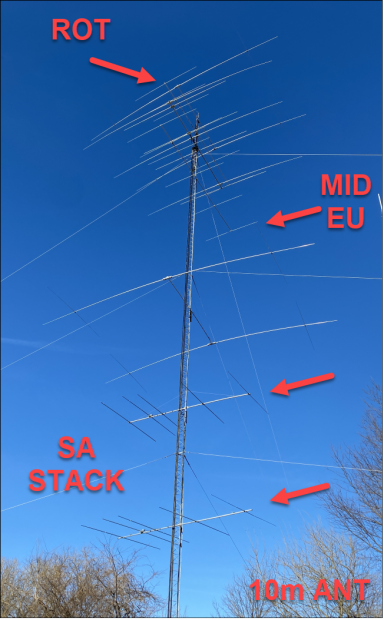 6-over-6 on 10m plus 6 elements fixed on SA The 10m station antennas: Top: rotating 10m JK106 6-element/35 foot yagi at 133' Mid: fixed-on-EU 10m JK106 6-element/35 foot yagi at 114' Lower: fixed-on-SA 5-element/24 foot yagi at 51' & 35', BIP stacked fixed-on-SA 10m 5-element/27' foot yagi at 35' ** Taking What You Can GetThe middle slots on the two towers are left for the unfortunates of the setup; 10m and 6m. 40m and 20m are THE primary DX and contesting bands so the towers were literally built around getting the best possible result on those two bands. All other antennas were put on at heights that were defined by what was available, rather than what would be optimal. Tower assignment depended on which combination yielded the least interference. Because 40m and 15m don't play well together, they must be on separate towers meaning 10m goes with one, and 20m with the other. If 20m and 40m were on the same tower, one would be a compromise from height at a minimum. So 20m gets it's own tower seperate from 40m and lives with the 15m stuff. That leaves poor 10m as the last man standing and he's assigned the open spot on the 40m tower. The 10m beam sits between the 40m Moxon above and the 17/30m dual bander below. Unfortunately for the 10m beam especially, both antennas interact to an extent. This is hard to get around because as frequency goes up, even sub-features of surrounding and mostly non-interactive antennas can get into the interaction game. Interactions in the worst case ruin patterns, kill gain and screw up SWR. But if you are lucky, the interactions are minimal and while you take a small hit on each of these, the antenna can remain operational for the most part. I got lucky because that minimal but present interaction case is exactly what I have with top 10m. And it's great that the result was good, because the only alternative other than an additional tower (which is not happening) is moving to a location at 30' up on the test tower. Fortunately the array ended up looking pretty decent despite shortcomings of the top beam's location. Models