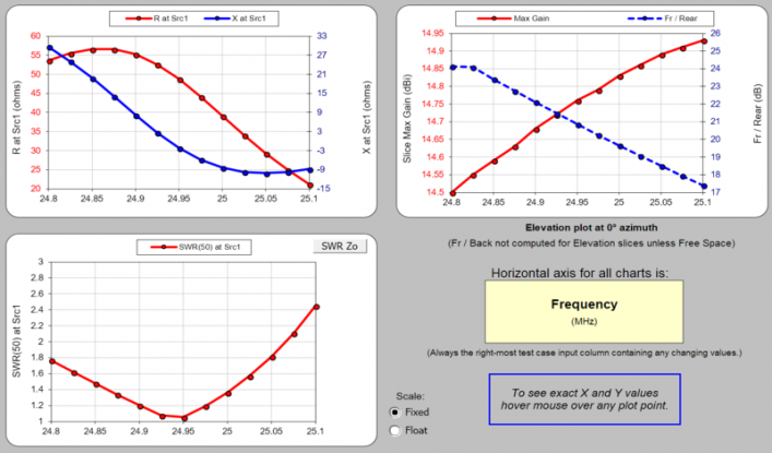 The plot below is a feature from the AC6LA AutoEZ EZNEC tool. Shown here are the R/Xj trend vs. frequency for the antenna, the SWR and lastly the gain + F/R plots. Very handy!!!