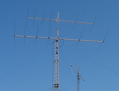 5-5-5 on 15m - plus 5 elements fixed on SA The 15m station antennas are as follows - controlled by a stack switch, directed by the Microham SMD in the shack: Top: rotating 15m JK155 5-element/36 foot yagi at 116' Mid High: fixed-on-EU 15m JK155 5-element/36 foot yagi at 92' Mid Low: fixed-on-EU 15m JK155 5-element/36 foot yagi at 68' Bot: fixed-on-SA 15m reworked KLM 5-element/36 foot yagi at 54' Shown below is the JK155 assembled and awaiting truss hardware attachment.