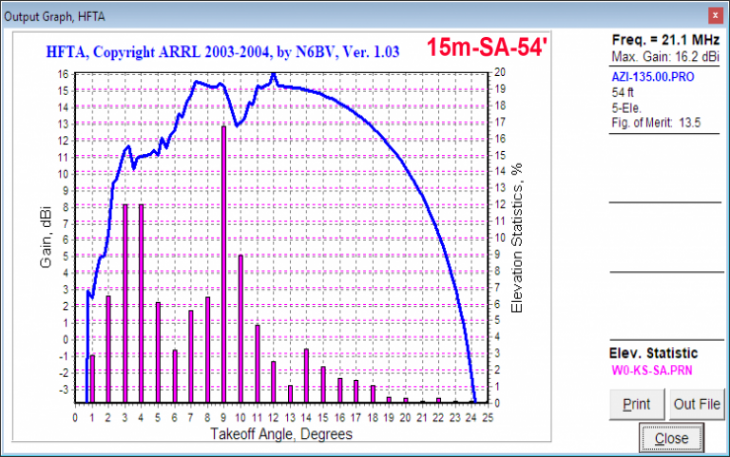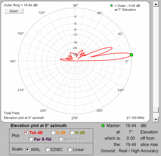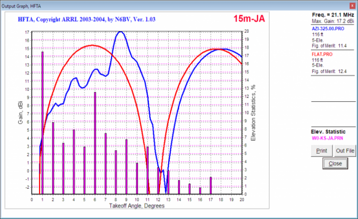 JA, like other bands, suffers greatly from the terrain problem off to the NW as reflected by the flat ground (RED) plot below. Notice how the actual top rotating antenna suffers by as much as 5 dB due to the land topology alone, only catching up to parity at about 8 degrees and above.