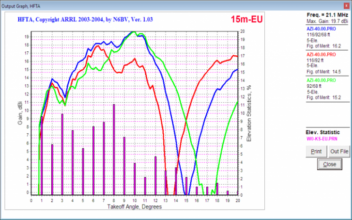 The EZNEC model with the 3-high stack looks like this. Peak gain is a bit over 19 dBi with a nice top and rear pattern. The 2nd primary lobe falls at about 21 degrees. HFTA AnalysisBeaming to EU in a fixed stack (BLUE) has a pretty good plot with almost 20 dBi of gain at the peak. Most of the EU signals are going to come in a angles a bit lower but the stack gain is still good as the TOA drops. Top-2 (RED) and bottom-2 (GREEN) are some of the other options available for switching by the operator and would help if you happen to be trying to work a close in guy who's down in the null.