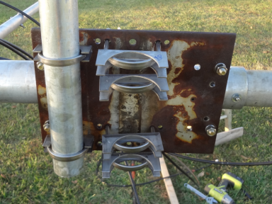 The original Telrex steel mast plate (12x12x1/4) was used with modifications to accommodate a 2-3/8 steel truss pipe. The original steel truss stranded wire was reused with new clamps added. The plate is literally too heavy to do anything other than just use! While the Telrex boom is massive, it's weight as well as the added elements results in the usual boom sag and so serious hardware was called for on the truss. Fingers crossed!