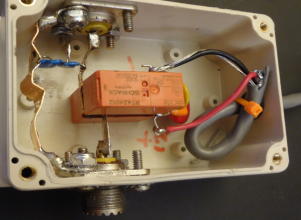 Shown here is the relay box internal construction and it's as-mounted position. It hangs below the DXE switch and is somewhat sheltered from the elements. Works great and restored the expected 17m SWR that had eluded me. |