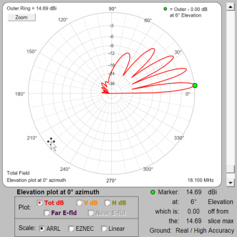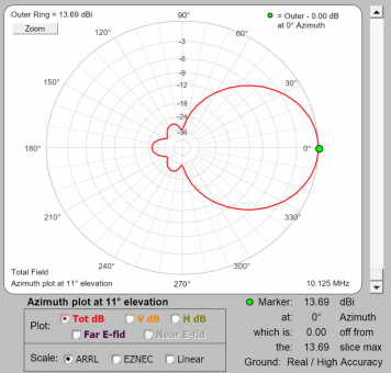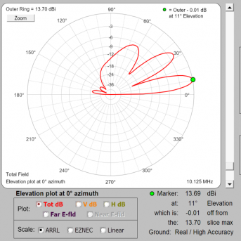 The completed beam mounted on the temporary test-tower for checkout is shown at right I started out with some Telrex beams in my bone pile and an idea that I could homebrew a 3-element 40m beam from the parts building it on the cheap. I had heard the Telrex beams were the top of the line back in the 60's and 70's but that despite a reputation for being built incredibly well there were comments on the internet that the Telrex beams (especially the 40m) would not stand up to high winds and tended to lose element tips. Sure enough with subsequent analysis running the DXE Yagi Mechanical application against the element construction, failures were predicted at speeds below 60 mph. With local wind speeds expected in the 85 mph range (in fact a wind speed that was encountered in March of 2017 and who's damage precipitated the entire tower project!), that limitation was definitely a problem. Of further concern was that all this analysis assumed aluminum used in the Telrex was equivalent to 6061 however I was not able to confirm that meaning it could be of some softer variant meaning actual failure speeds could be lower yet. A second use of the elements for a 30m beam was considered. I had always wanted a serious 30m beam as the band is a good DX band through the entire solar cycle and with most hams using wires on the band, a full size beam at height would provide a big signal advantage when chasing the rarer ones. Unfortunately the same mechanical analysis suggested element failures even in the shortened 30m length. I had been considering wind but ice loading is a problem around here as well. After some time playing with ice loading values in Yagi Mechanical, I determined that 100 mph would be a more suitable build-standard that any of these antennas I put up should meet. Especially with big antennas up on the rotor for which falling elements could damage lower antennas on the tower and generating more troubles. The 4th tower - originally earmarked for the WARC bands - would not be built due to the difficulty of clearing the trees in the area along with a very wet summer. Fortunately modeling indicated that the 30m beam would coexist fine with the 10m/40m antennas planned for the 40m tower without interference leaving 12m and 17m without a home for the moment. It looked from the same modeling analysis that 17m would play nice with the 10/30/40 beams on the same 40m tower - but 12m would not. That solved the immediate WARC antenna problems - and with the solar cycle heading down, I ignored 12m thinking it would literally be years before a beam on 12m would be needed.