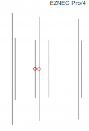 With 3 beams planned for the 12' of available mast above the rotor, the logical place to put the 17m beam was to try to interlace it on the 30m beam boom. The 40m elements resized for 17m duty would have plenty of strength for 17m service even if they were not built from 6061. And it looked like two of the existing mounting points on the old Telrex 40m antenna boom were close enough to optimal for the 17 director placement that it could make element mounting simple. Eventually a 3-element 30m beam with a 4-element 17m beam on the same boom was the final design choice. ModelThe model is relatively simple (shown right). Separate feeds allow simultaneous use of both antennas at the same time avoiding any shared-feed complications. The main challenge was to optimize gain and pattern while keeping enough spacing between elements to avoid unnecessary physical interaction. Fortunately while the 30m elements do move around quite a bit in the wind, the part of the 30m elements adjacent the 17m elements maintain their spacing very well. That combined with the minimal interaction between the two beams mean both antennas are pretty stable from an SWR standpoint even with winds. Model-Predicted Performance - 30m