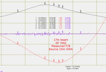 Another view of the finished antenna shown here under test. Only minimal adjustments were needed compared to the model to bring the antenna into tune. Measured F/BI tested the antenna's front-to-back with the beam on a 30' tower. A beam about 175' distant was used as the reference. The test is conducted by pointing the test beam at the reference antenna, running a VNA through-cal to establish a zero baseline, and then rotating the antenna away from the reference. The path will show loss (or gain if the cal was taken with the beam pointing away) - and that difference value serves as an indication of front-to-back. The actual values are less important than the general position of the curve which we hope is showing it's peak somewhere near the ham band. In both cases the F/B was very nicely represented, especially in the 17m case. The distance between the two lines in the plot represents the F/B of the beams. Ignore the +/- sign of the value - the beam was so huge and my rotor was having a hard time turning it so I did not want to rotate it another half turn to get the two references back to both positive or both negative. 30m plot is shown at left, 17m plot shown at right.   One Last Overlooked DetailOnce the antenna was mounted on the 40m tower, I had a rig on each antenna, eager to check it out. Everything looked great but at some point in the testing my Yaesu FT2000 had gone more or less silent. Hmmmm. After some investigation I realized that I had failed to check antenna isolation between the bands. The VNA proved what I had suspected... With a transmitter on 30m, the isolation is very good at about 46 db. But transmitting on 17m the pickup by the 30m element is only 11 db down. Zaaaaaapppppp goes the preamp. I had purchased an additional set of 5B4ANG switched BPF kits but never got around to building them up. Based on this experience - that would be next on the list of things to get done before allowing 17m & 30m simultaneous operation again!
