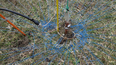 The 160m vertical radials are below ground which left a free working surface on the ground. The plan from the start was to lay the radials on the top of the ground and let the grass absorb them over time. Overall each of the 4 verticals is in a clear part of the field but for some of the radials there are no-go zones (trees, creek paths, gravel drive, etc) where a full 1/4 WL radial would not be possible. So I put down at least 30 1/4 WL radials on each antenna as a minimum. And in the case that there was some limitation I increased the number of radials in that area greatly. Actual radial counts per vertical are as follows: NE 28 radials SE 36 radials SW 57 radials NW 65 radials A circle of #6 copper was laid out and the radials soldered on. Radials were made from #22 teflon coated stranded wire, pinned at each end and in low spots on the ground using landscape u-shaped nails a couple of inches long. In total there are about 200 radials among the 4 verticals. Feedline