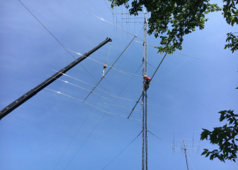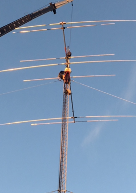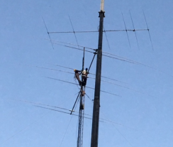 Here's a ground view photo of the JK206 on the way up after the 15m and 6m antennas were mounted to the mast. That antenna is huge on the ground and even bigger when you are hanging off the mast at 130' up! The Towers - Dec 2017