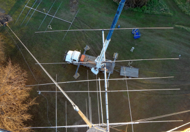 The Final Configuration - July 2018In one day with temps in the 90s we pulled down the remaining Hygain-based home brew OWA and swapped them all out with new JK-made beams. Here's what the 20m tower looked like after the work that very long and hot summer day. A 2nd JK402 2-element 40m beam was mounted on the 40m tower as well. A number of things remain - some antenna tweaking, a bit of alignment and the mounting of the last 10m beam. And the stack controllers for the top 4 bands. All projects for another day. N0XA (SK) told me when I started this project that towers were a never ending demand of time with something always in need of doing. His words describing this were somewhat more salty that my paraphrase but he was right. With towers, something "always needs doing." Shown below - the 20m 5-ele fixed on SA beam flying by crane.