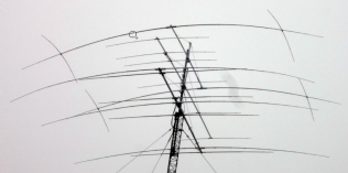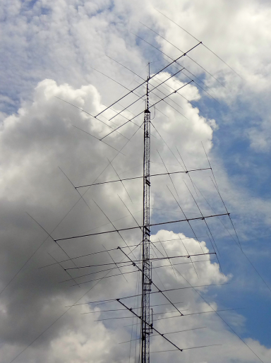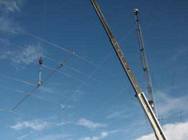 Flying Big Beam, Cranes, Riding the Mast Pipe and More There were a number of firsts for me. I had never climbed above 65' before. I had never climbed a mast pipe. I had never mounted an antenna with a crane. In retrospect it's really a miricale that the project went as smooth as it did overall! A total of 11 beams were laying around waiting for a lift up on the two towers. In the photo below are the 10, 15 and 20m JK monobanders. At right on the spool the JK 2-element 40m, and in the background the 5 reworked beams of KLM and Hygain orgin.