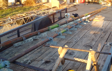 The towers were put up with the rotors loosely installed at roughly the right level. Feedline was brought up in a bundle and attached to the tower at the top and then later strapped to the tower the length of the tower down to ground level. Short jumpers ran from the top of the feedline to a KF7P junction block. The next step was to lift the mast onto the tower. Stairs were attached to the masts in advance (see photo above of masts with stairs laying in the trailer). Masts were lowered from above the tower using the crane, slipping the mast end through the thrust bearing and into the waiting rotor. Once the mast was attached, the homebrew 30m/17m beam was brought up by the crane and mounted first. Shown here at right. Next up was the JK106, a 6-element 10m beam on a 36' boom.