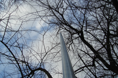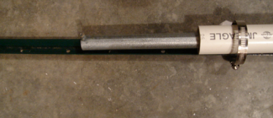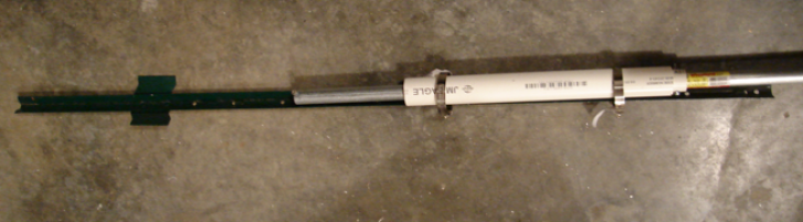 A pair of concentric PVC tubes of about 12" were cut for each vertical. The smaller PVC tube was secured to the pipe with a long screw. A small screw is mounted at the end of the conduit and will later serve as a connection point to the buffer amp. The verticals were assembled in this order: - The small fence post is driven into the ground.