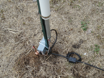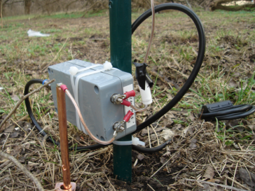 In each case, care was taken to maximize "sameness" - meaning the ground rods were driven to the same depth, spaced away from the fence post by the same amount, and the verticals spacing above the ground was the same for each vertical. At that point, the buffered-amp was mounted to the base of each post. And the wires were attached to the vertical, each attaching wire (both element and ground side) were trimmed to the same overall length in line with our sameness objective. Looking at the final result, in these two pictures you can see the mounting detail. Plastic zip ties secure the box, and the coax is wound around the post to provide a stress relief in the event the cable is snagged for whatever reason.