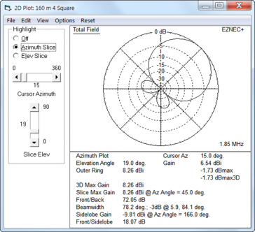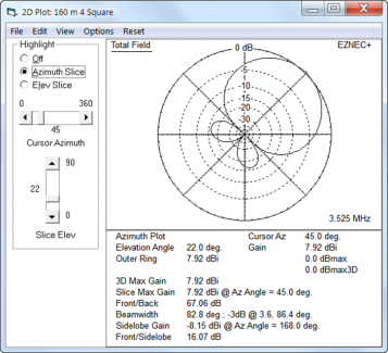 Broadcast Band IMDThe system worked fine right from the start. However, on my bandscope, I could see some spurs showing up indicating some IMD products creeping up from the AM broadcast band. In discussing the problem with Hi-Z, they suggested I try some Hi-Z supplied passive notch filters. You can see the small filter attached to the terminals in the photo above, right (white small tube). I added some sophisticated weatherproofing (a bit of black electrical tape) over the top end to keep the water out. And that was the end of the IMD from the circle. Closing Comments - Hi-Z 4-8 PRO circle arrayMy first experience with an active system has been a good one. Rotating the array can be an amazing experience as you click from one to the next and see a given signal pop out of the noise. I eventually got the 80/160m vertical put up right before the 160m contest (about a month later) and that was a fun contest as a result. No end of signals to work. And from a noise standpoint, there is no comparison with my transmit vertical - 100% of the time the circle is better. The circle does have one behavior which may or may not be of benefit. That is the same thing that makes it so quiet (directivity) is also a problem when you don't necessarily want as much directivity (contesting). If you are lucky enough to have a strong transmit signal such that you can leave the array beaming in a single direction, that works great. But I sometimes need to work that direction knob in the shack quite a lot. And for a fast exchange contest like CW, that can drive you nuts as well. The lesson here is that there is no free lunch. If you get your quiet performance through directivity, be aware you will need to get that directivity working in the sender's direction! Which leads me to the one and only criticism of the system. As delivered, the direction switch has a hard-stop at 0-degrees (north). My preference is to have no hard stop, and if a hard stop is required, then let it be at about 250 degrees or so. My solution for this was to turn the control box over, so that it sits upside down, that move the stop to the 270 degree point. And then I rotated the wires in the array, moving each vertical ahead 4 slots (so vertical 1 became #5, vertical #2 became #6, etc) which restored the switch pointed up = array beaming north functionality. It's almost not noticeable other than the Hi-Z label is inverted. I also moved the rubber stand-off to the top (now bottom) of the case and it's worked great since. Not the most elegant solution but it worked for me! Modeling the CircleA proxy model of the 8-circle is to build a basic 4-square model. Plots for the 8-circle from this type of model are as follows. This is based on the compromise phase line lengths (a split between max-RDF and max-F/R).