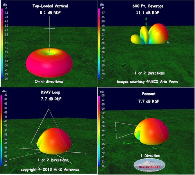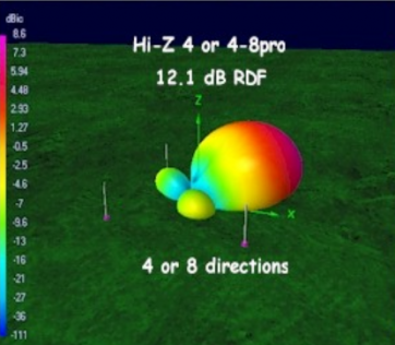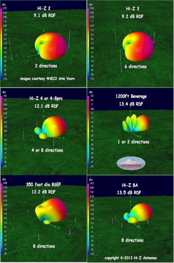 For the most part, the pattern remains mostly clean between the bands and is really amazing, when compared to the beverage who's performance is very tied to the frequency vs. length. This assumes an ideal current balance from the control box which is not realistic, however. But the result of current variance (either from the box, from the vertical positioning or other areas where the "sameness" goal is not held ideally) would be increases in the lobes somewhat. These variances - as well as the growing contribution of the fixed-length delay lines compared to the phase inversion transformer eventually cause the pattern to break down as frequency continues to climb. In general, I find the full-sized 40m 4-square to outperform the 8-circle . Hi-Z RDF Comparisons