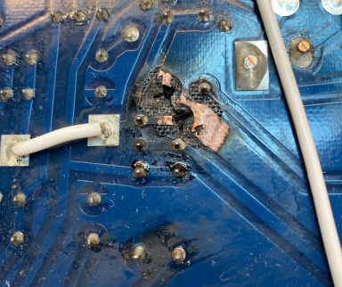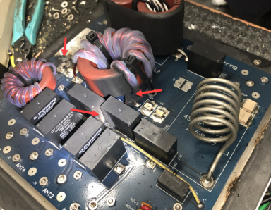 The 80m 4SQ was behaving oddly. It had high SWR on all of the individual directions, but SWR was fine on the OMNI mode. The OMNI circuitry is located before the directional stuff and I was able to make a guess that there was damage to the directional side of the box, and that the individual verticals and their feeds were probably OK - if not, the OMNI mode would definitely show it. That proved to be the case. With the controller back on the bench, the oder of fried circuitry was strong even with the nearly water-tight cover still in place. When opened, the damaged seemed every where. Circuit board arcs, more arcing between two relays and a literally blasted SMT cap jumped out right away.