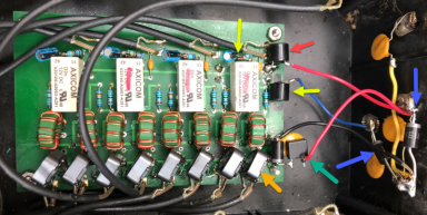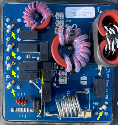 The array output runs through a final amp that is in the same sort of box as the buffers but has a F-connector in/out. Similar treatment was given to that unit as what you see here on the buffers. Additionally, modifications were made to that unit to feed the PS directly and not needing to use a bias-T arrangement which is my personal preference. HiZ Repairs & Hardening - 4 of 8 SelectorThe HiZ Pro 4-8 Circle is a set of interlaced 4-square systems. An intermediate box selects between each of the two sets of 4 antennas based on one of the control lines, and that set of 4 is fed to a separate box which has the phasing circuitry and direction selection. The box also provides the bias-T function on the PS end which is what all the inductors along the bottom of the board are for. Hardening this box involved a number of changes. 1. The OEM system does not have any built-in fusing and to improve field diagnostics capability, I added separate fuses to both the switching control line (yellow arrow, middle of page) and the PS feeding the relays (red arrow). These are slow-blow types of about 500mA capacity. I chose slow-blow because I wanted to avoid replacing soldered fuses should I momentarily touch the DC carrying buffer feedlines to ground. I assumed that in the event of a strike, the voltage and thus current would spike resulting in a fast blow under those dire circumstances despite the "slow blow" type. By looking at which fuse was later blown, it would help to unravel what may have been whacked in a subsequent event. 2. Added similar tasked fusing to the PS line feeding the bias T (green arrow). On that line there is also a HV bypass cap added for good measure and another TVS diode to clamp it. 3. The blue arrows are an additional set of TVS diodes from ground to the PS input and another one to the control line. HV bypass caps added there as well. 4. Not part of the hardening process but also implemented are some small R/C snubbers across each of the relays. When changing direction it helps cut down on the switching spikes observed in the radio (see top arrow pointing to one of the RC sets). The snubber rounds off the waveform and reduces the HF energy as a result. 5. The most obvious change was to swap out the inductors with ones that could sustain a buffer amp short and not self-destruct under sustained shorted-buffer conditions. This is somewhat overkill given the added fuse, but we ARE hardening, right? I found some SMT types that were shielded and rated for about 700 mA of constant current - but they were quite a lot larger so the total count was split with half mounted on each side of the PCB. That's what the small gray colored items are below, indicated with the orange arrow. The inductors are Coilcraft MSS1260-105KLD.