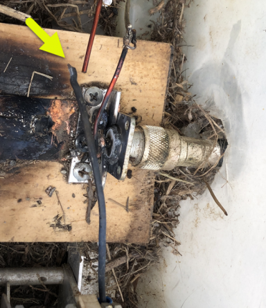 The 160m vertical is shorted at the 2x8 DXE antenna when not in use so I suspect that relay and the 325' feedline was hammered by the strike, but it remains operational now with no apparent problem. It's also possible there was some arcing in the matching net but I did not notice it. The damage to the 160m tower was minimal. A small gauge wire was used to jumper a center conductor from a SO239 over to a series matching cap and it blew - an easy fix. No other damage was evident. Note that the burning shown in this is from a prior torch use to do a field patch of wire, and not from this lightning event. There is some carbon scoring dust on the connecting wire (visible in the photo) but nothing else. Retacked that wire and the 160m antenna was back in action The matching net was intended only to serve a temporary function but it's worked so well I have never got around to fixing it. I should as it's apparently a nice shelter for mice as well as a fine matching net. A guy told me once that the meaning of "temporary" to a ham was actually "until it breaks or falls down" - I think he was right. 160m Hardening
