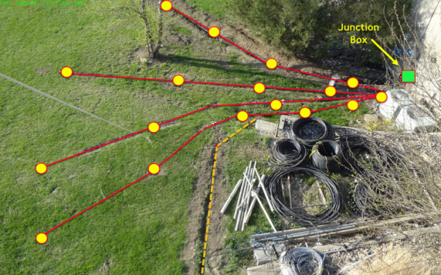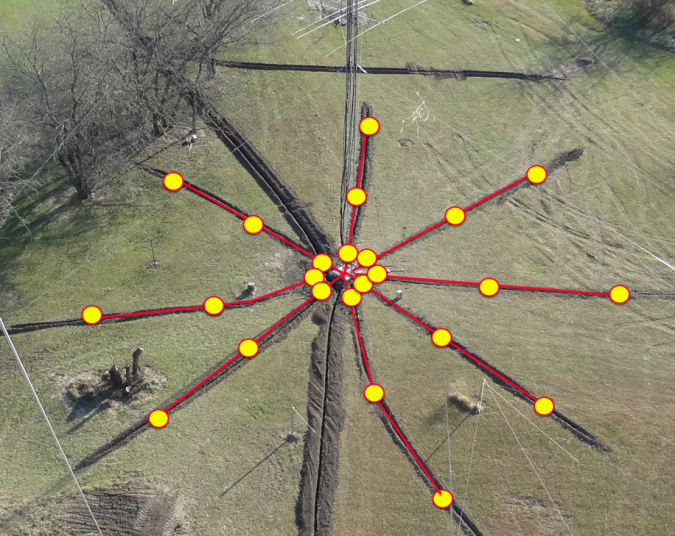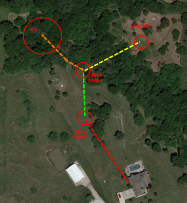 I had decided early on to keep the switching in the shack and run control lines out to the field. Lightning damage is a problem with a lot of the wireless and field located control solutions so keeping things hard wired seemed a the best choice from a reliabilty standpoint. About 100 control lines were needed to manage all the switching; about 50 to each the 20m and 40m tower. I was fortunate to find an ideal cable for the task (shown right). It's a direct-burial rated line with a heavy aluminum shield and 50 conductors of about 20 gauge solid copper wire dating from the 1980s. Unfortunately there was not enough to do the entire job with the 50 conductor stuff but another stroke of good luck had me litterally stumbling across another source of 24 conductor flooded wire made by AT&T that had been setting in a local's field for so many years the reel had deteriorated into powder by the elements. Flooded cable is a lot more messy to deal with when prepairing but I'm sure it will last my lifetime as the 50 conductor stuff will. The 40m tower was fed with the 50 conductor cable, and the 20m tower fed with two runs of the 24 conductor cable - enough for the task in both cases. In additon the rotors needed some large gauge wire for the motors plus the pulse sensor lines. I used 12/3 UG (4 conductor including the bare ground wire) for the rotor motor runs and to provide a path for the +28V DC line that eventually terminates out by the receiving antennas. For the pulse sensor I used two of the control lines but was sure to test that well before covering the trenches. It's proven a solid rotor control solution. Runs from the ground up the tower to the rotors were made with Wireman rotor cable which is a pair of 12 gauge plus a pair of 18 gauge. The Wireman cable is used in the shack as well for the runs from the Green Herron controllers to the shack junction box. Approximate control cable totals are: 50-conductor 500’ 24-conductor 1200’ 4-conductor 120’ 12/18 rotor 300’ 12/3 UG 770’ Tower GroundingShown below are the ground rod locations for the 20m tower. There are 8 legs of #3 insulated stranded copper extending from the tower. 8' rods are located at 6', 20' and 36' out from the tower. The 40m tower has a similar ground rod configuration made of 6 legs ground rods with the #3 wire connection.
