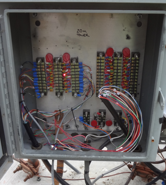 The 40m tower junction box has more lines than the 20m as it hosts the control lines for the receive antenna site as well as the 160m/80m site.