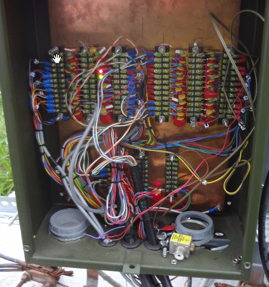 The shack entry box is built by KF7P Chris and is an excellent platform. For the latest tower setup I mounted terminal strips on the backing plate to accommodate MOV clamps for the 100 control lines that exit through the panel. Most control lines also have LED/resistor/capacitors on them which are a huge time saver when troubleshooting. The site topology is focused on So2r so only two hardline runs are needed from the towers back to the shack - the 3rd connection is for a dedicated 6m feedline. The copper backplate connects via two runs of strap down to the ground network.