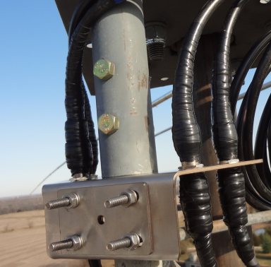 The 40m tower has a similar grounding structure. There are 5 antennas in on this tower which are run through Polyphasers. Hagar clamps, lots of messy copper loaded goop and the circular #6 connecting all 3 legs follows the 20m tower setup.