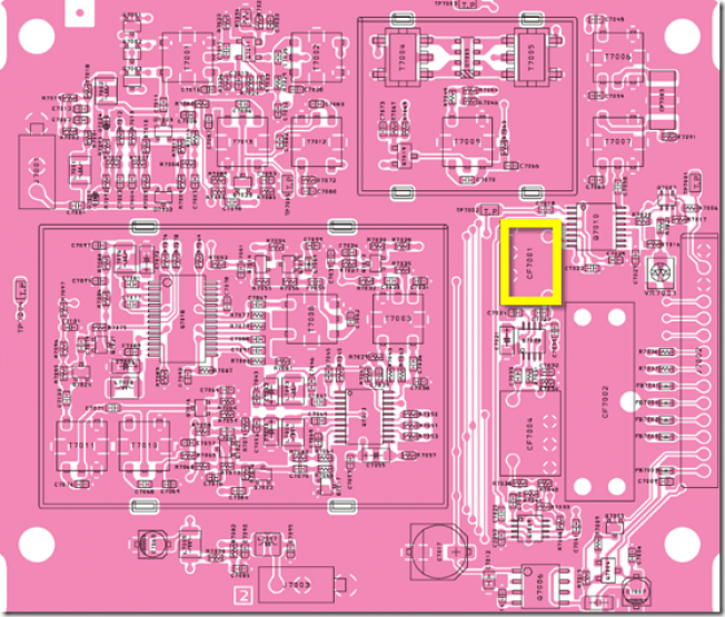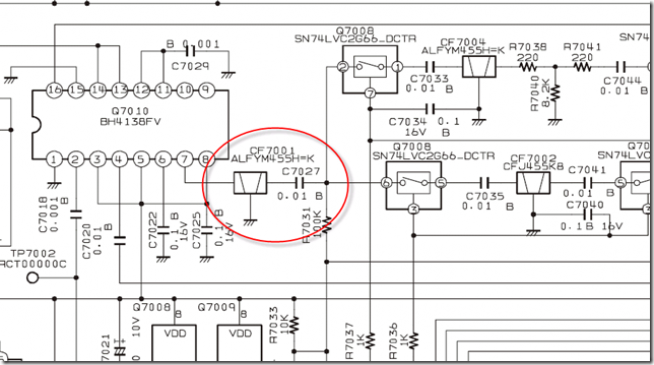 Note: While the card is out, you may want to consider adding a DC blocking cap to the left side of CF7001 which may help to prevent this problem in the future. After replacing the filter, and reassembly, the operation is restored: