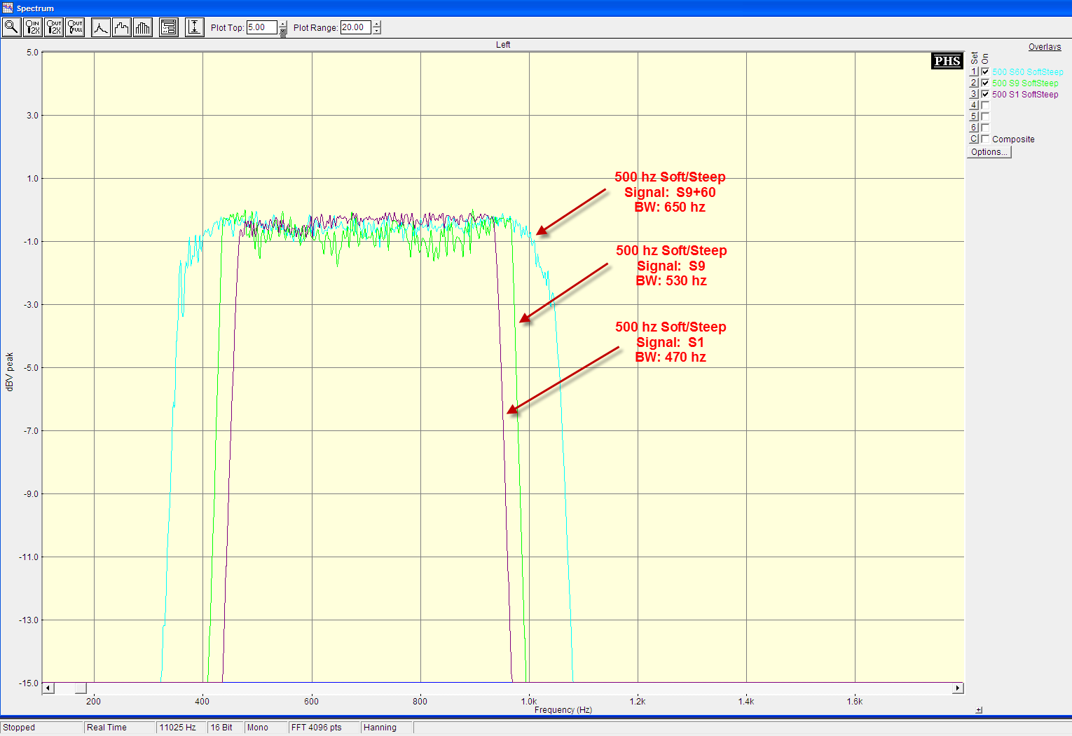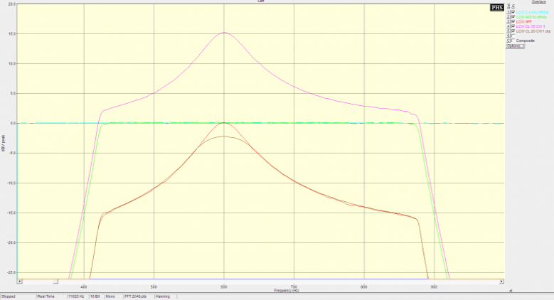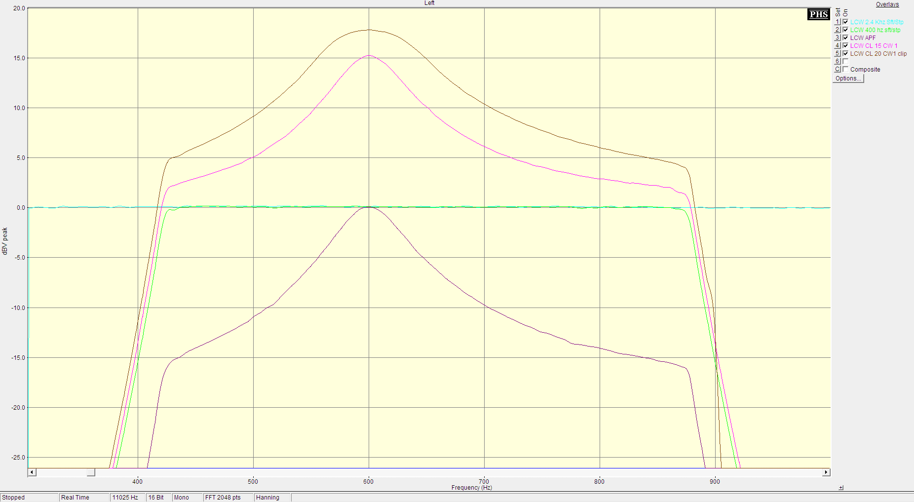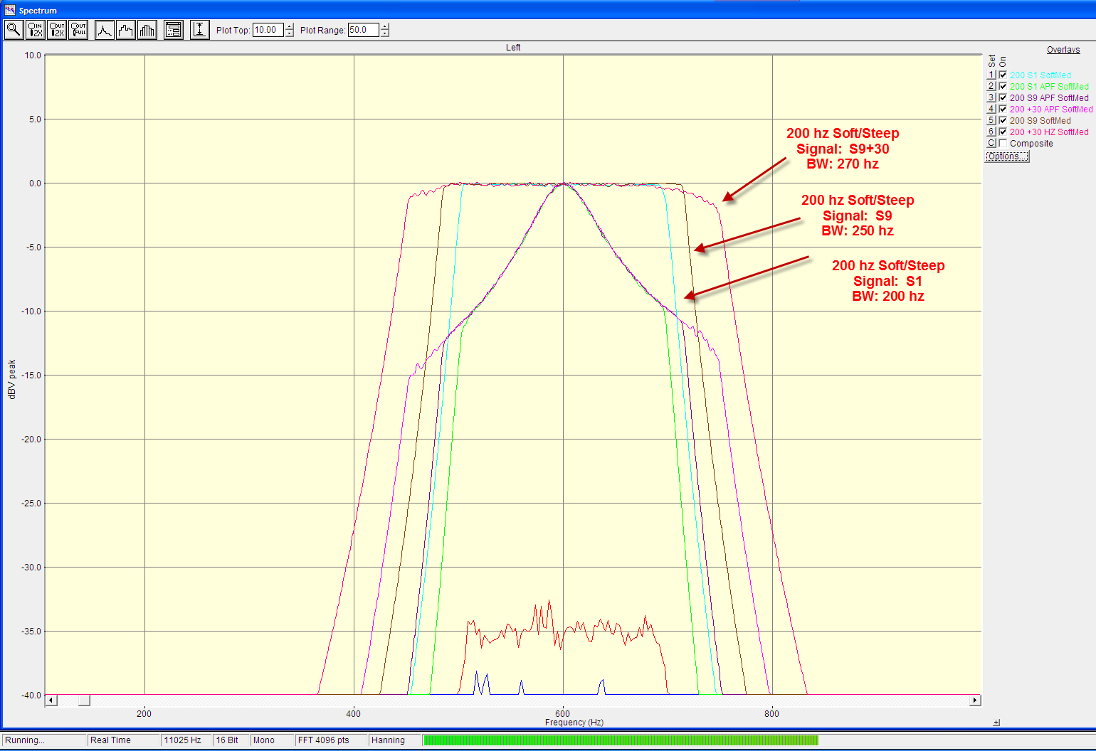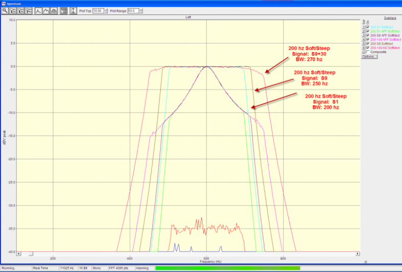 Finally, we consider the effect of the contour width in comparison to the APF. Here we consider a 400 Hz LSB CW mode filter with soft/steep form factors. Below the APF trace is represented by the bottom, most steep shape case. The green line is with the APF disabled showing the square top DSP filter shape. The contour widths are altered - and to allow for a matching of the various shapes, I have shifted each of the plots down so their peak values line up. Of course, the rig would provide the significant boost and the shapes would not line up in this way. But this organization allows you to consider the effect of other settings - as an alternative to the APF if you were to find the +20 effective setting of the APF too narrow for your preference.