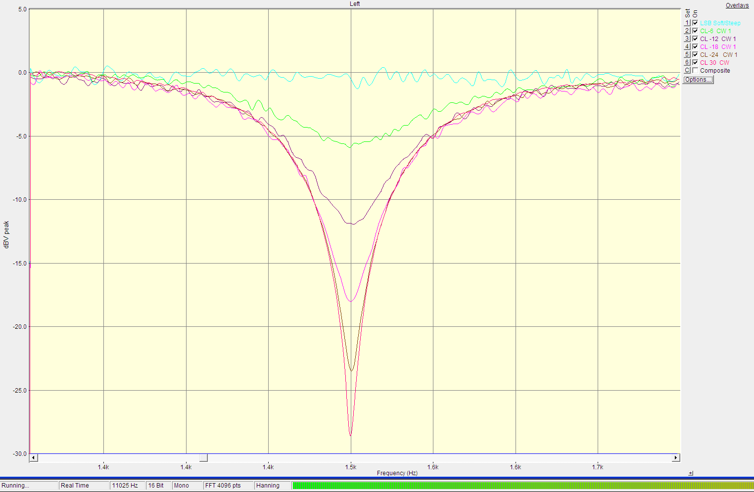Yaesu describes this feature as an ability to put a user-adjustable amount of gain or null into the otherwise square-shaped passband of the DSP filter. See diagram on the right from the Yaesu operation manual. This is a pretty good description of the contour function as the testing proved. From the menu settings, we have two choices, LEVEL and WIDTH. Yaesu's operation manual comments are shown to the left. LEVEL is described in terms of dB. My measurements confirm this as accurate. WIDTH is described as Q-factor. Here, Q is not being used in the literal sense as one could calculate it from the graphs - but it's used in a more generic sense. Lower width settings, imply a higher Q, and that means a more narrower filter characteristic. Contour TestingContour can be either a null or a boost. We consider the null case first. In the plot below, contour width is set a 1. And level adjusted from 0 to -30 dB. Frequency range is