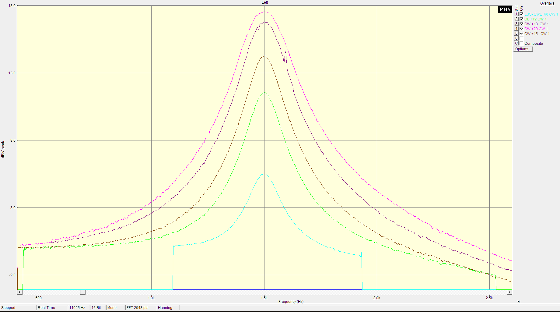 The rig's output remains clean up to the +15 dB point (below, LEFT). However, at +16 and above, the onset of clipping is observed. Notice in the graph above the +20 point does not peak with the expected +5db level over the +15 setting due to compression clipping at some point in the AF/DSP chain. From this, we can see that using the contour in the peak mode, levels of +15 dB and less are needed to avoid distortion products unless the signal is low enough to be below the AGC action threshold.
