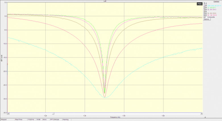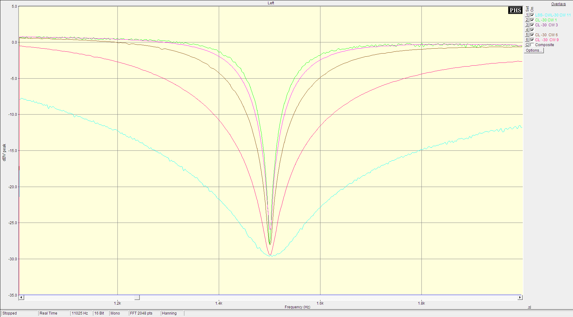 The actual rig filter plot is very smooth - the variations in the plot you see here are related to the speed at which I swept the curve and these wiggles in the plot don't exist in the filter. In the graph below, level is fixed at -30 dB, and width is adjusted over the range of 1-11. Notice the slight tilt down on the right side of the graph:
