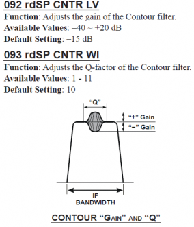 For the Yaesu firmware wish list: As a practical matter, I don't think the filter slope is very critical after the first perhaps 20 db if we are talking about general contest or DX work. But perhaps a better way to provide increased utility would be to have user-adjustable ultimate attenuation in the stopband. I notice that Flex is now starting to advertise how perfectly vertical their filter "brick wall" response is. While it's very nice for show and tell to visiting hams, generally an operator, especially with CW, wants to be able to hear the other stations above/below with some amount of amplitude. In fact, the PickAStar group with filter legend Bill Carver has added a very interesting feature where the ultimate attenuation of the filter is adjustable. In most rigs, the filter attenuation continues down to the limit of the rig's DSP dynamic range (around 60-100db, depending). The FT2000's DSP has a dynamic range of around 90db (from the rear panel AF OUT jack) - the slope is not vertical, but it's tremendously deep. Personally, for CW work, I almost never need to move the passband (using the SHIFT control). If Yaesu were to add in this feature tied to the SHIFT control (perhaps pressing A+adjusting the SHIFT), that would be a very useful tool indeed! Contour The APF feature is not very useful to the SSB operator. And here the CONTOUR function comes to play. Yaesu's operation manual does explain the function of the contour control pretty well, and presented here below are some graphs to help us put some engineering values to these various setting numbers.