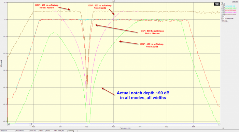 - The wide-mode notch setting is not suitable for CW operation - notice the left side of the graph in the 500 Hz mode - there is some interaction between the notch if the width is less than 800 Hz. Unfortunately, Yaesu does not offer DSP width settings in CW between 500 and 800 Hz