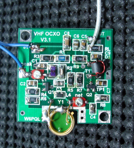 And I think the board could be positioned so that 3 resistors could be put into contact with the oscillator in an orientation something like this. The challenge of this installation is to thermally bond the resistors to the top of the CTS oscillator. The bond needs to be done through an electrical insulator because only one of the resistor ends is grounded. The thermistor could be soldered just to the right of the CTS oscillator. In the end, I could not think of a good way to ensure the board could be made to stay in contact with the crystal. Guys with more mechanical skill and a better night of sleep would probably find a good way to make this work - as it's a very simple implementation. However, in the end, I decided to try another of Jim's kits - the OCXO combination board. The Ultimate Solution - An Oven Controlled Crystal Oscillator for the IF-2000The kit I used for this project is found here: http://www.w6pql.com/vhf_ocxo.htm Jim has arranged the oven controller circuitry on one side of the board. And laid out the a buffered Butler oscillator on the other side of the board. The crystal can be soldered into a gap in the boards end simplifying the mechanical construction aspects greatly.