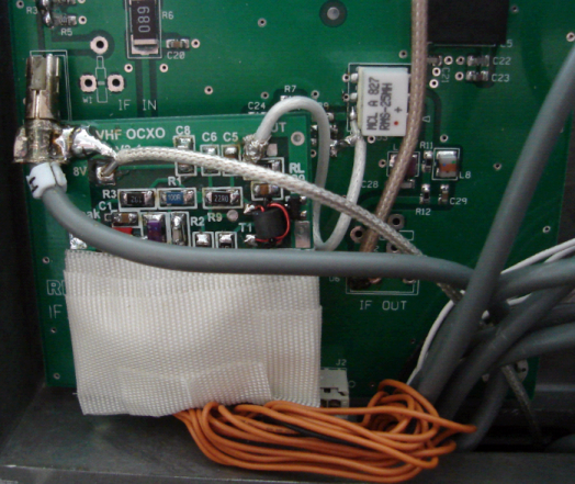 Mounting the OCXO onto the IF-2000 While the oscillator worked, I was unsure if the IF-2000 would play properly with the new OCXO. So mounting followed a quick-and-dirty thought process... Power and IF-2000 modifications are detailed later on the page (below). For thermal insulation, I just wrapped a few layers of 3M fiberglass tape around the lower end of the board. This provides enough insulation that the resistors are able to heat the crystal enough to regulate the temperature. And for a physical mount, I soldered one corner of the OCXO to the "H" connector (that's the coax feed line from the rig's scope buffer circuit). OCXO Power Source
