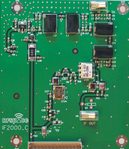 Oscillator Side Most of the parts in the kit are on the oscillator side shown here. Adjustments are provided to trim the oscillator frequency as well as adjusting output. The oscillator is intended for VHF/UHF applications and in this case, the oscillator ran at 112 MHz with the default components. Jim recommended adding a 33 pF cap in parallel with L1 and that worked great. The oscillator ran at 80 MHz right away. A couple of other component adjustments were needed to increase the output (the MC mixer on the IF-2000 is rated with a +13 dbm LO drive...). The changes were: R2 - Replace 330 ohm with 1000 ohm R8 - Replace 150 ohm with 120 ohm D1 - remove (serves a clamping function)