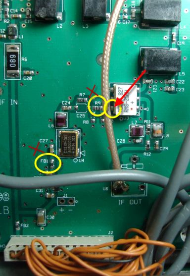 The OCXO requires an 8V regulated supply and the LO board of the FT-2000 provides that without trouble. IF-2000 Board Prep After getting the OCXO built and tested, it's time to fit it onto the IF-2000 board. Here there are 3 items to attend too: 1. Remove FB1 - this removes power from the CTS oscillator 2. Remove R9 - this disconnects the CTS oscillator output from the mixer input 3. The output of the OCXO is fed to the mixer's input (the white component, with the red arrow pointing to the input). Remember, this is 80 MHz VHF land, so keep leads short. I soldered my center conductor of the mini-coax to the mixer input, and tacked the coax ground to one of the unused solder points below R9.