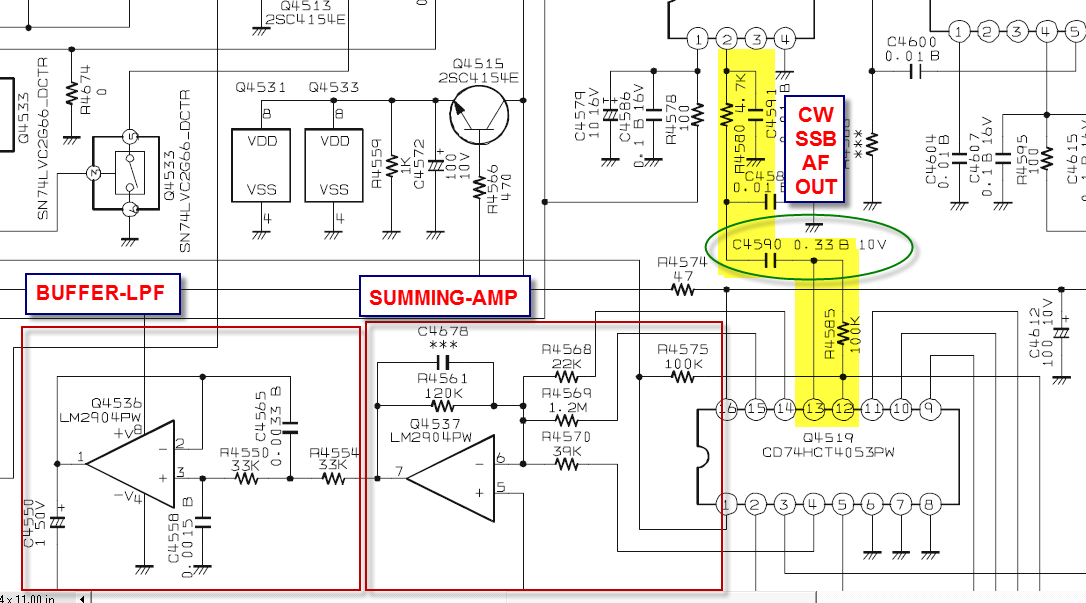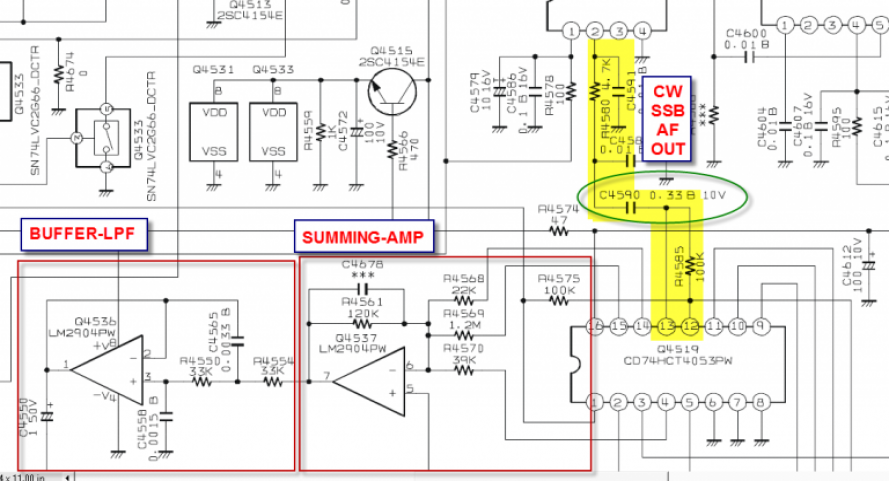 A Mod for the Flat Low End ResponseThe main RX has a nearly flat filter response down to about 50 Hz and then it rolls off in SSB modes. For CW, the main RX DSP action rolls off the response starting about 400 Hz. By comparison, the sub has the similar response on SSB and CW. Extending nearly to zero Hz. My personal preference as a primarily CW op is to have the low end roll off. The low end contains quite a lot of AF energy and is fatiguing in prolonged listening sessions. And even when listening to voice modes, I prefer to have less low end content for the same reason. When considering mods for the rig in general, there is a engineering decision to be made between simplicity vs. effectiveness. So in this case, by changing the value of the coupling capacitor, we can introduce a single-pole roll-off response and see how satisfactory that is in actual use with minimal modification complexity. The response graph above, in the upper left corner, shows the effect of changing one capacitor in the sub RX from the stock value of 0.33 uF to 0.015 uF. Of course, other values would provide more or less roll off in comparison. I also tried value higher and found the 0.015 uF to be the best overall compromise value. There are two minor side-effects to this mod - in the CW narrow mode AF passband, the response has about a -3db "tilt" from right to left. This is not significant in my listening and I prefer to have too little low end, vs. too much. This modification does not affect the AM or FM modes. Mod Details: Adding Low End Roll-offTo implement the similar modification, consider the schematic and PCB drawings that follow. The signal path for all CW/SSB mode variations is through C4520. The rig provides two stages of low pass filtering, first a pi-network (yellow highlight) just prior to coupling cap C4590 - and then a second pole type located at the output buffer amp Q4536 (bottom left red box). Lowering the value of C4590