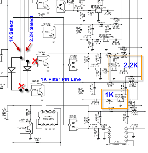 A Better Solution? - The 1K Filter ModThe roll-off mod detailed above works great in making the rig *sound* better. But it does not provide a meaningful amount of close-in selectivity. The roll-off is just too gentle. As speculated earlier, a better solution would be to try to work out a mod such that the narrower 1K filter in the CW-wide position. The benefit of using the narrower filter is that the low end would have a steep attenuation similar to what we enjoy with the narrow 300/500 Hz option. Adding a variable frequency multi-pole LPF filter on the AF output (located in the speaker?) - along with a 2-pole Q=10 bandpass filter to bring the APF would result in the sub having quite similar capabilities to the main receiver's DSP. A prerequisite to doing this mod is to have the ability to determine when the RX is in the CW mode. Unfortunately, there does not appear to be separate mode decode lines off of the serial to parallel link to the control board. There is a CW indicator on the VFD, which implies a matching CW line somewhere on the control board which could be routed for the purpose of switching the filter. Instead of hunting this down, I decided at the beginning to test the approach just to simply route both the 2.2 and 1.0 KHz filter switch lines together through a diode pair - such that they enable the 1.0 KHz filter in all cases. As a result, the 2.2 kHz filter is unused following the 1K Filter Mod. This turned out to be no significant compromise because the actual width measured of the 1KHz filter was closer to 2KHz! 1K Filter Mod - Surgery Road-mapThe mod involves cutting the two traces which lead to the darlington pair which drive the PIN diode switching. Then, adding a set of diodes which serve as an OR function - so that the 1KHz filter PIN diode line is pulled low with either a 1K or 2.2K signal from the upstream controller. Schematic follows. Note: Done carefully, this mod is fully reversible. Schematic Details for the 1K Filter Mod