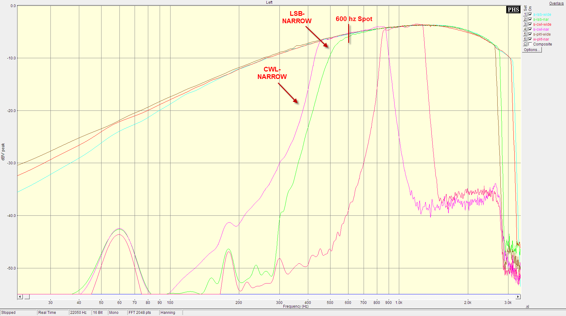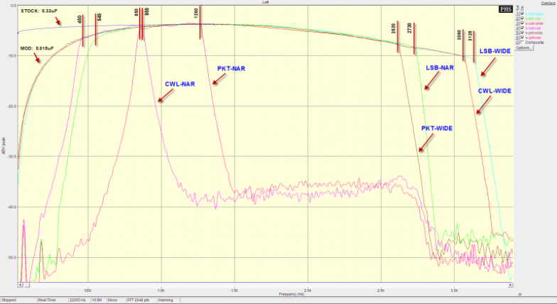 The plot compares the filter response of 3 operation modes, in both the wide and narrow settings. Calculated passband widths are given in the following table: Mode | Filter Mode | Fl @ -1db | Fu @ -1db | Width @ -1db | LSB | Wide | 50/450 Hz | 3125 Hz | 3075/2675 Hz | LSB | Narrow | 545 Hz | 2730 Hz | 2185 Hz | CWL | Wide | 50/450 Hz | 3060 Hz | 3010/2610 Hz | CWL | Narrow | 450 Hz | 865 Hz | 415 Hz | PKT | Wide | 50/450 Hz | 2620 Hz | 2570/2170 Hz | PKT | Narrow | 50/450 Hz | 1260 Hz | 1210/810 Hz |