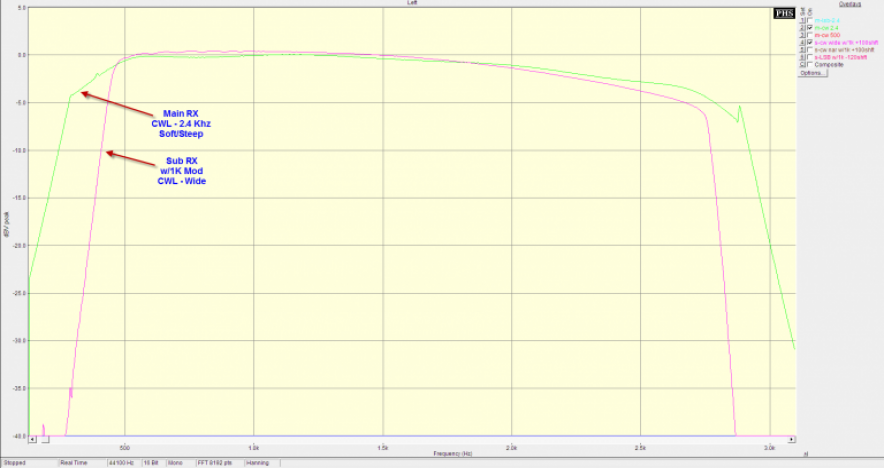 1K Filter Mod Results: Mode - CW WideWhen the DSP is set in the soft/steep position, the transition is more rounded than the sub receiver. The plot below compares the 2.4 KHz DSP default of the main receiver with the modified sub. IF offset in this case was +100 Hz. Less offset would provide more low end response shifting the entire curve to the left. Note that the IF shift applies to both the CW wide and CW narrow settings. CWL: WIDE - Main RX - vs. - Sub RX with 1K Mod