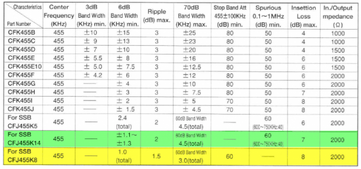 1K Filter Mod: ConclusionsI am very happy with the results of the 1K Filter Mod. It's easy to implement, reversible and provides an excellent low end stop. Used with the switchable 300/500 filter option, or with an active filter solution of some kind, true variable bandwidth low ringing response would be available. Adding an APF capability similar to the main RX would be easy as well. While I am curious as to why the 1K filter seems to behave so "wide", it ultimately works to advantage here in that the net passband is completely adequate for SSB use. MURATA DATA SHEET - The 1K filter is shown in yellow.