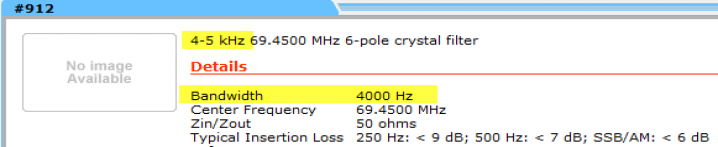 The bandwidth of the filter characteristics are unclear - listed as a "4-5 kHz" filter on the top line, and under the bandwidth section, "4000 hz." No transmission plot is provided for the filter. 50 ohms nominal termination with the correct center frequency for the FT-2000. Insertion loss is not given specifically, but rather generally in the table where I interpret it to be as "<6db" typical The Statement The confusion stems from this statement found on the announcements portion of the Inrad web site linked here: http://www.inrad.net/inrad.php?mode=announce , and which says: