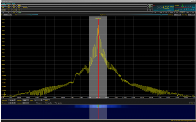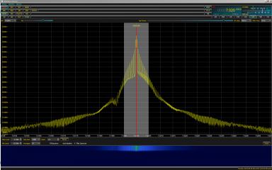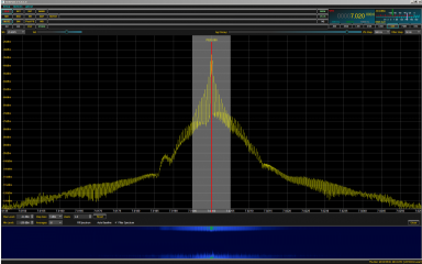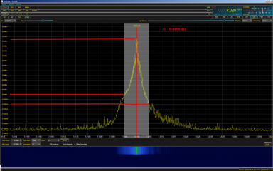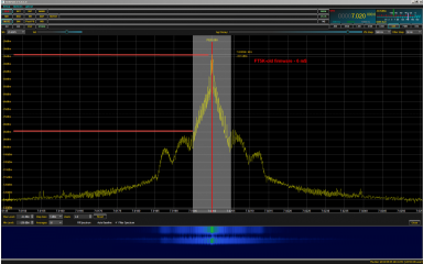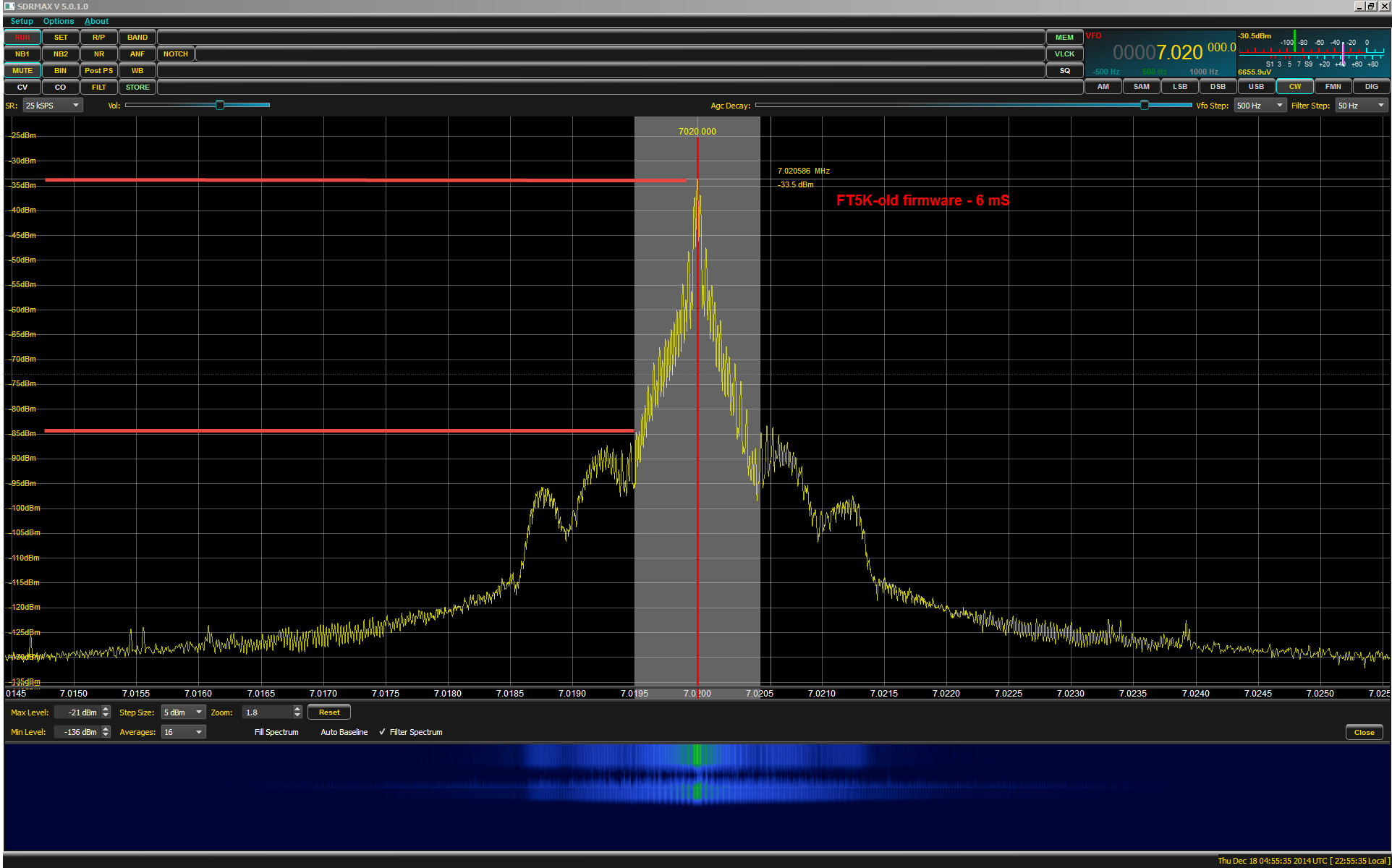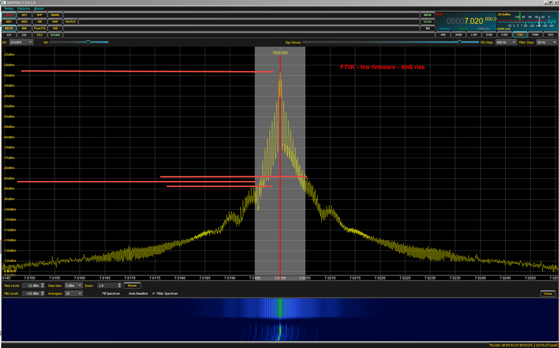 Putting firmware 0127/0547 to the test Yaesu issued a firmware update with the description "CW keying bandwidth is improved." Below we take a look at some of the test results and assess the effectiveness of the new code version. At the end, I have pulled the same data from the K3 for comparison. Test results were gathered using a QS1R. Rigs were run at full power (200W Yaesu, 100W K3). I had considered using the Rigol SA but the RM noise was judged to be too high for close-in analysis. CW mode; 60 WPM dit string. CW Occupied Bandwidth - before update The FT-5000 provides 4 user-adjustable settings for rise time. As the rise time is shorter, the occupied bandwidth should be degraded. The plots below are arranged in 6-4-2-1 mS sequence. Signal levels at an arbitrary bandwidth of 1 KHz provides a basis for comparison, although the Yaesu has quite a spread of energy content at about the -60 dBc level as can be observed from the single and double bump shoulders seen in the plots. 6 mS - click for full-size view  4 mS - click for full size view