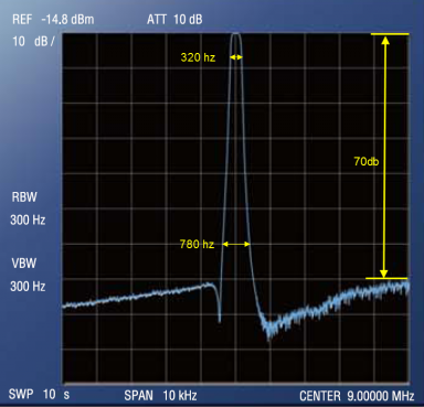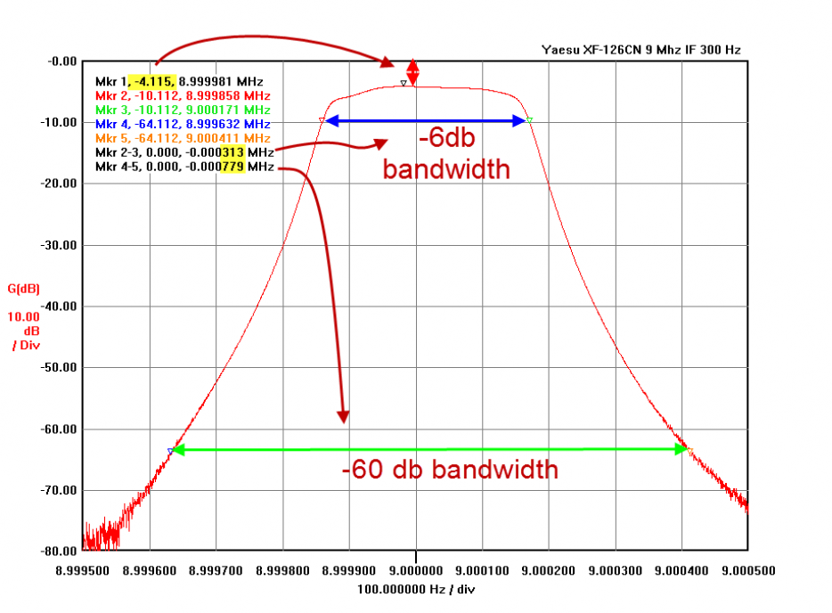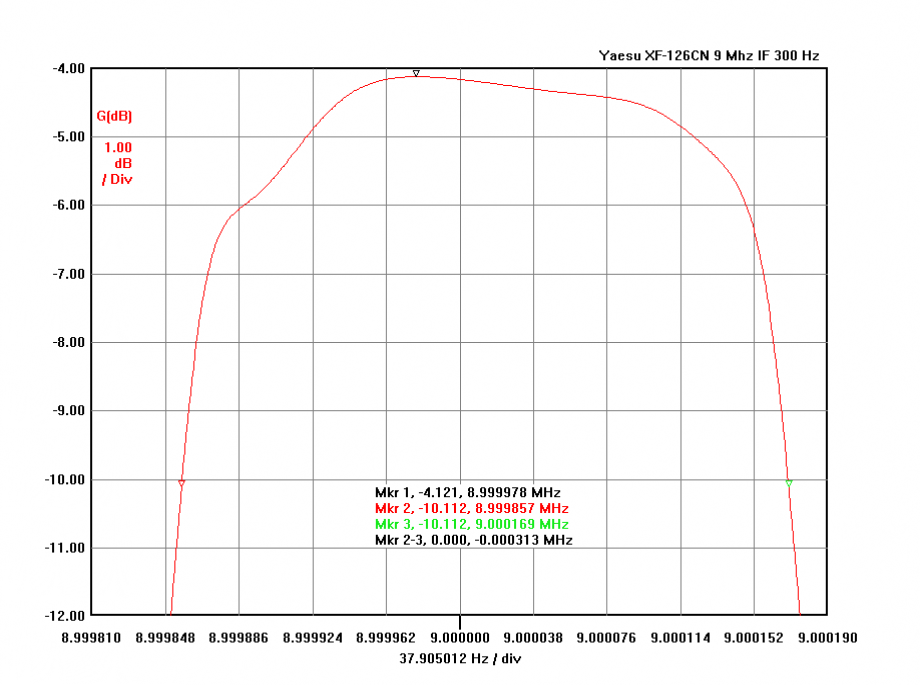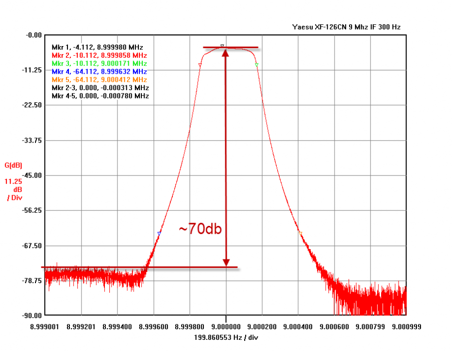 From the Yaesu FT-5000 advertising brochure, we find this plot of the 300 hz filter shown at the right. Note: For proper setting of our expectations, we will consider that the exact test method that the brochure tests is unknown. The notation on the plog "REF -14.8 dbm" suggests that the filter was tested in the radio rather than seperately. So we want to consider if the numbers we deduce from the brochure would make sense or not in our analysis to fowllow. With some magnification and scaling, we can estimate the values of the critical characteristics based on the given span of 1 khz/division horizontal and 10db/division vertical. -6 db bandwidth: 320 hz -60 db bandwidth: 780 hz Attenuation floor: -70dbc From this we can calculate the shape factor at 2.44. Insertion loss is not specified but a typical 6-pole 9 Mhz design would run in the 3-6db range. These numbers do seem to make sense for a filter advertised as being "300 hz" in width. And so for the rest of the evaluation, we can make the assumption that whatever the test method used by Yaesu, our filter-only comparison to this data would be a reasonable compare. Bench Test Results Note: Because the filter has a non-standard termination of about 500 ohms, I used 16db minimum loss pads to handle the z transform. Calculations were pulled from the chemandy.com page on-line tool which was very handy for this kind of thing and works great in practice. Looking at the attenuation floor of the filter, the first of the Yaesu claims can be put to the test. Here we see a roughly 70db gap between the filter passband and the filter floor.