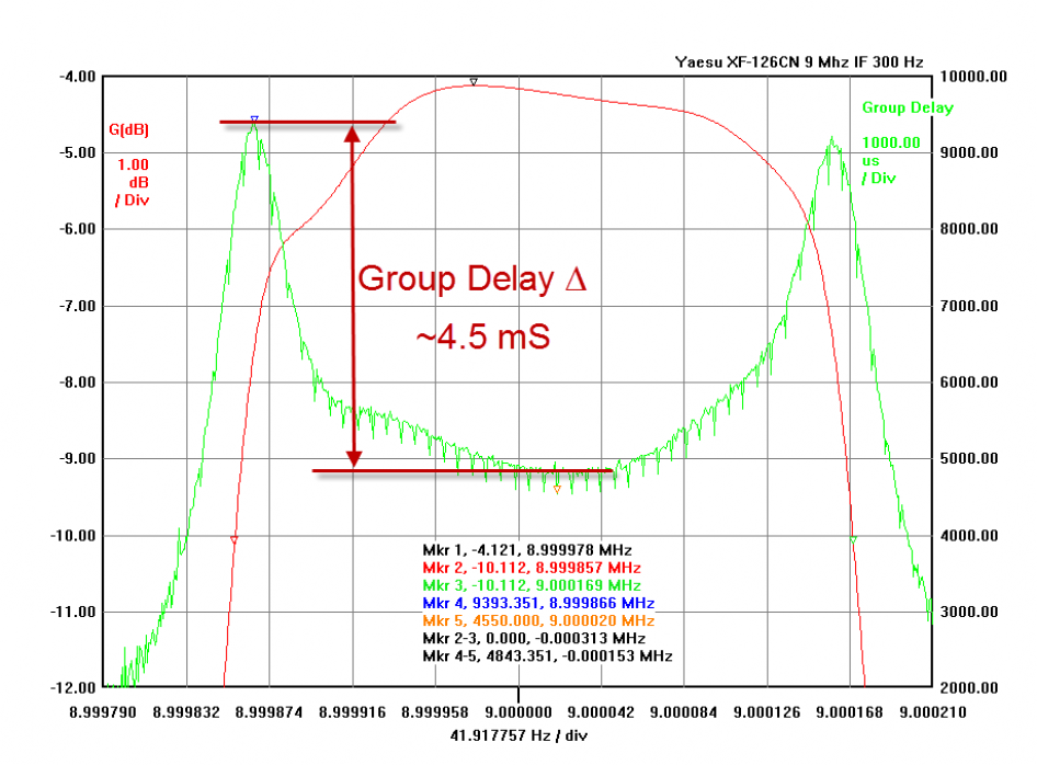 Inquiring minds want to know if the advertised characteristics of this filter match up with the actual performance - and how the important but never publicized value of group delay looks. Bench work was taken from a XF-126CN filter characterized using the veneruable N2PK VNA. Data was confirmed by a 3rd party independent lab - a step taken because the termination of the filter is around 500 ohms in the nominal case and the normal work I do is all close to 50 ohms. It was great to see nearly perfect agreement between the data taken here and that of the professional lab. BackgroundThe FT-5000 is a departure by Yaesu from a string of up-converting architechure rigs to a down-conversion. This move is surely driven by the market's focus on the close-spaced DR3 performance and the technological difficulty/expense of making high-performance VHF narrow filters with acceptable IMD characteristics. The location of the filter is listed in the block diagram shown below. The rig has quite a variety of filters available for the operator's selection. And on the serious selectivity end, a 3 Khz, 600 hz and a 300 hz. The 300 hz filter is what we are considering in this analysis.