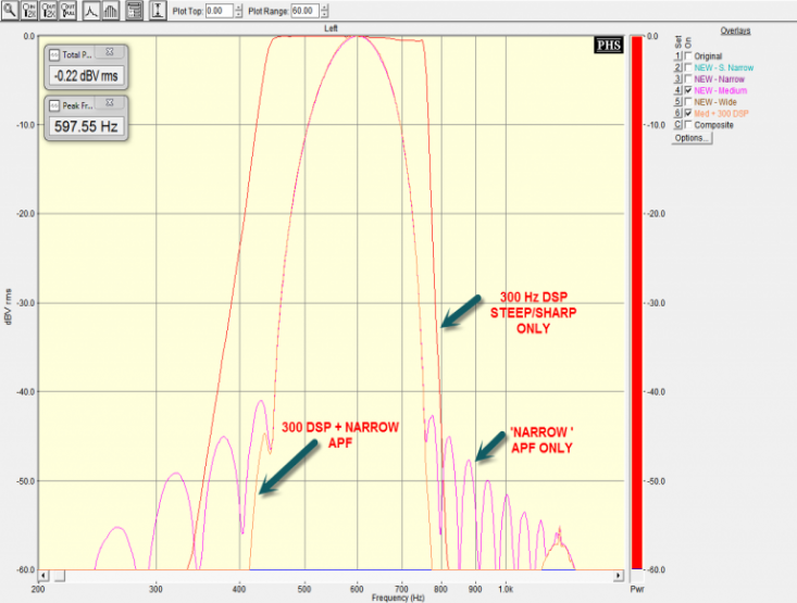 The APF filter choices may be combined with other filtering options. For example, in this plot we can see the filter spectrum of the 300 Hz DSP only, the MEDIUM APF only, and also the result of using both together in combination.